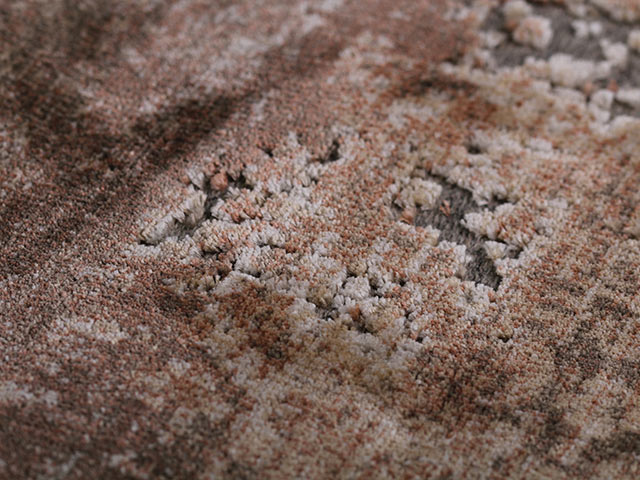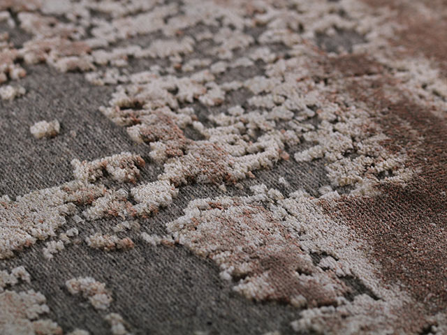 Der Tusa 2608 verbreitet mit seinem unregelmäßigen Design aus hell- bis dunkelbraunen Farbtönen auf grauem Untergrund einen nachlässigen Charme. Er folgt keiner geometrischen oder ornamentalen Struktur, sondern überzeugt durch seine individuelle Gestaltung, die ein wenig an ein altes, verputztes Mauerwerk erinnert. Man kann sich leicht vorstellen, dass er sehr gut mit antiken Möbelstücken harmoniert und Räumen ein warmes Ambiente verleiht. Unterstrichen wird dies durch das samtig weiche Material aus 70 % Schurwolle und 30 % Viskose.